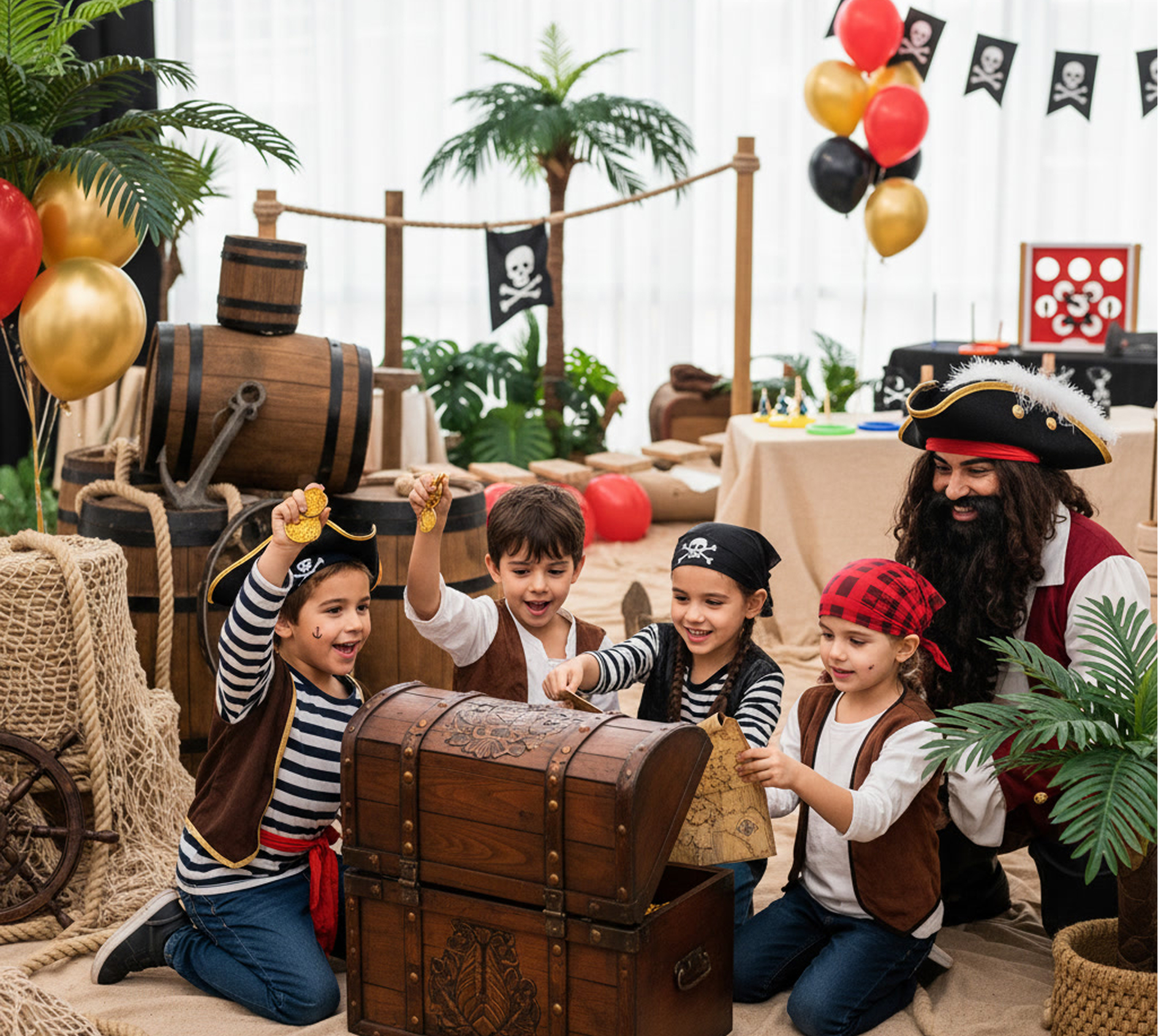 Tým je maskot Pirát Čierna Brada. Bezpochyby na oslavu nájdenia strateného pokladu nesmie chýbať pirátska minidisco s maskotom. Vyvrcholením dňa bude otváranie truhlice s pokladom, odmena v podobe balónových kreácií od animátorov a spoločná fotka na pamiatku na záver.